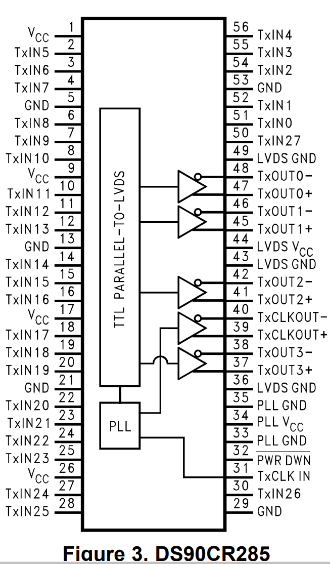 | 11 | Data | 16 | U32 | DS90CR285 | 47 | TX0+ | DATA0+ | |